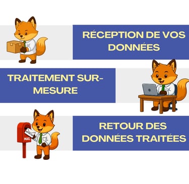 Rien de plus simple : vous nous transmettez vos bases de données à formater et nous vous les retournons traitées, formatées et/ou dédoublonnées. Pour les données spécifiques, nous vous demanderons de nous transmettre des règles de gestion et d'interprétation.
