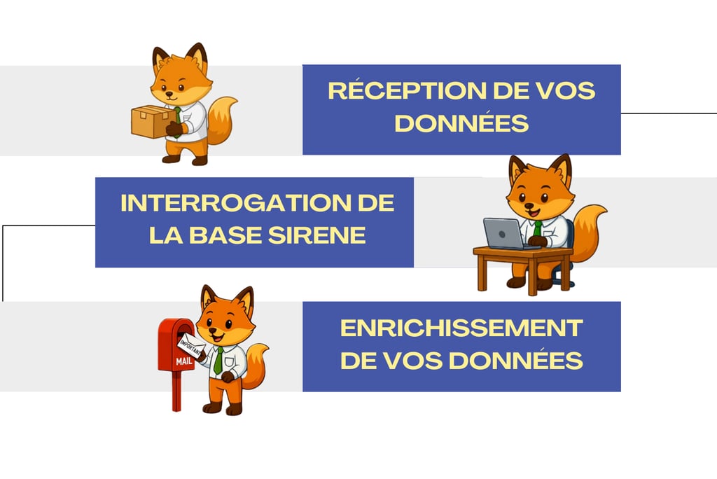 Pour obtenir ces précieuses données, nous utilisons la base de données étatique SIRENE, qui recense toutes les sociétés françaises. Par un algorithme robuste, nous interrogeons cette base pour faire correspondre un maximum de sociétés, selon la qualité de vos données.